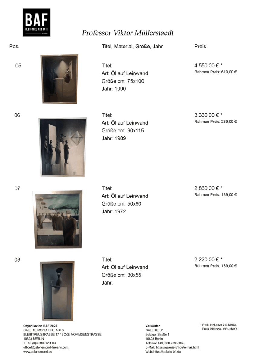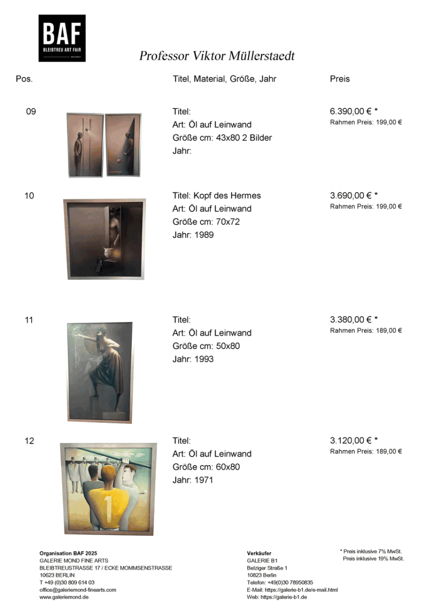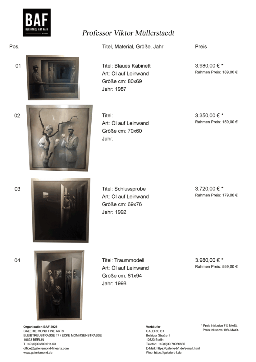 Ab Mitte der 1980er Jahre hatte er sein Atelier in der Bleibtreustraße 7.Die GALERIE B1 hat die offizielle Nachlassverwaltung von Professor Viktor Müllerstaedt.